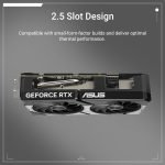 The VGA ASUS RTX 5060 Ti 16GB DUAL features a dual-fan cooling system with advanced axial-tech fan design, optimized heatsinks, and 0dB technology for silent operation during light loads. This keeps temperatures low and extends the card’s lifespan. Military-grade components ensure stability and durability, even during intense gaming sessions.