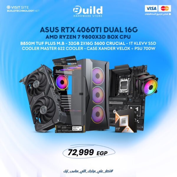 72.999,00 EGPA powerful next-gen gaming setup for pros and enthusiasts. Built with top-tier components including Ryzen 7 9800X3D, RTX 4060Ti 16GB, and 1TB SSD.