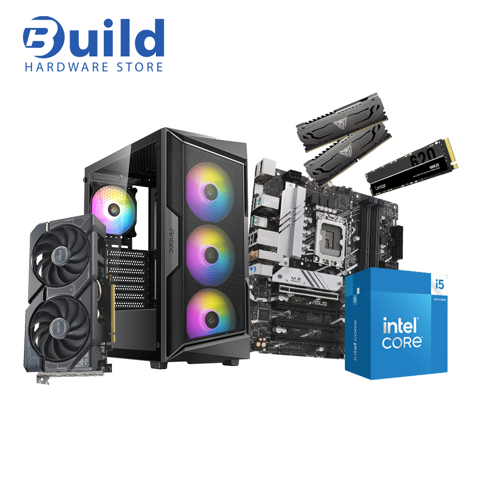 BUNDLE CORE I5 14400F – ASUS PRIME B760M A D4 – RAM PATRIOT VIPEER STEEL 2X8GB 3200MHZ – ASUS DUAL RX7600XT 16GB – SSD NVME LEXAR NM 620 1TB – ANTEC AX61 650W ARGB